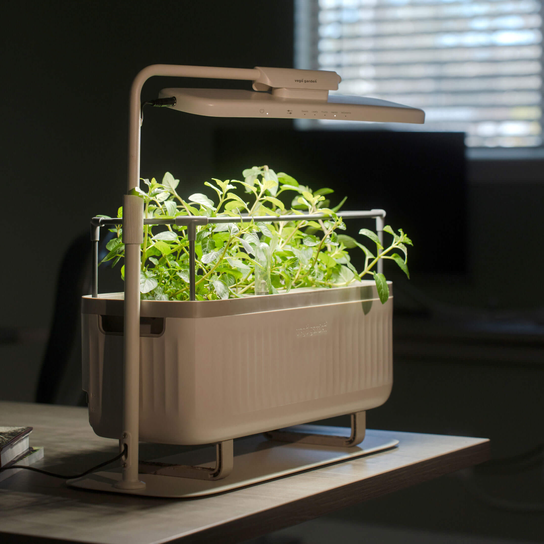 Vego Grow Light (included) supports seedlings, fruit, houseplants, herbs, greens, and microgreens.
